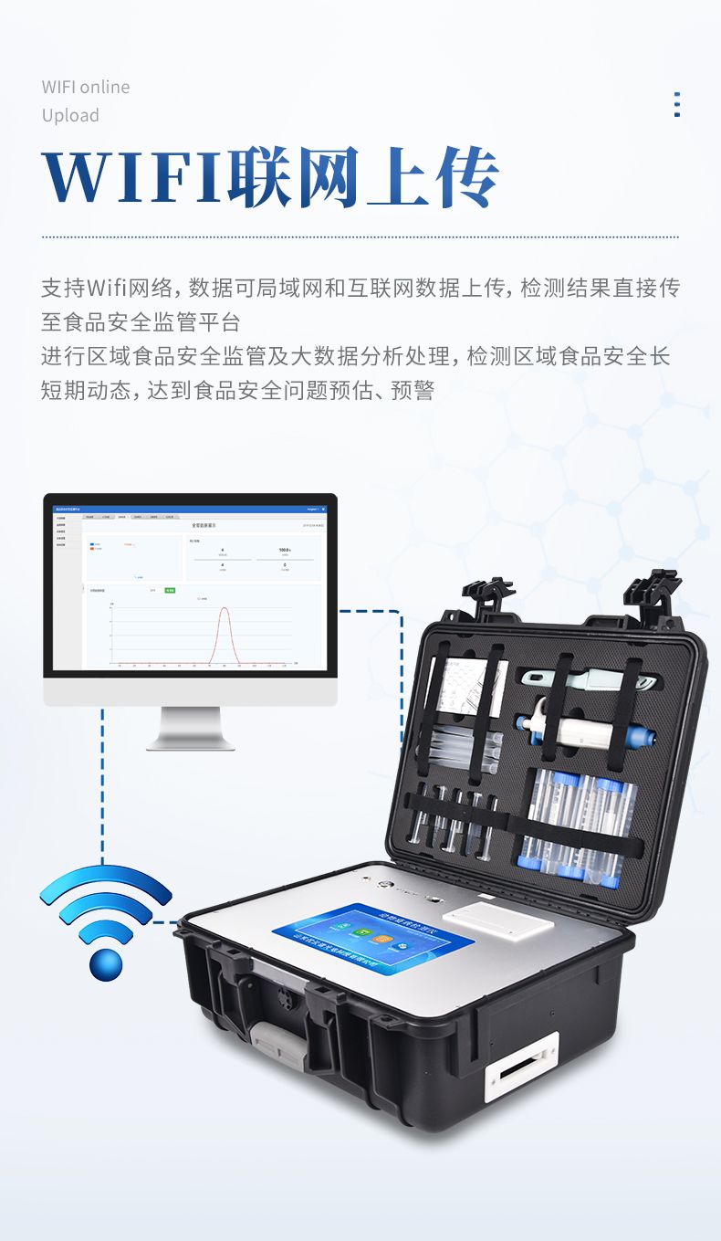 13、支持Wifi網(wǎng)絡(luò),數(shù)據(jù)可局域網(wǎng)和互聯(lián)網(wǎng)數(shù)據(jù)上傳,檢測(cè)結(jié)果直接傳至食品安全監(jiān)管平臺(tái)。進(jìn)行區(qū)域食品安全監(jiān)管及大數(shù)據(jù)分析處理,檢測(cè)區(qū)域食品安全長(zhǎng)短期動(dòng)態(tài),達(dá)到食品安全問(wèn)題預(yù)估、預(yù)警