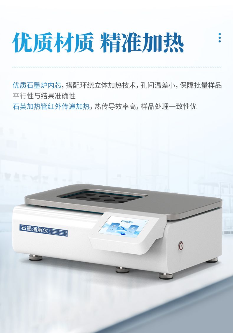 本石墨消解儀是替代傳統(tǒng)電熱板、電熱爐的理想選擇,同時儀器采用經(jīng)典的30 mm孔徑設(shè)計,完美兼容市場主流的50 mL、100 mL消解管,是實驗室值得信賴的得力助手。