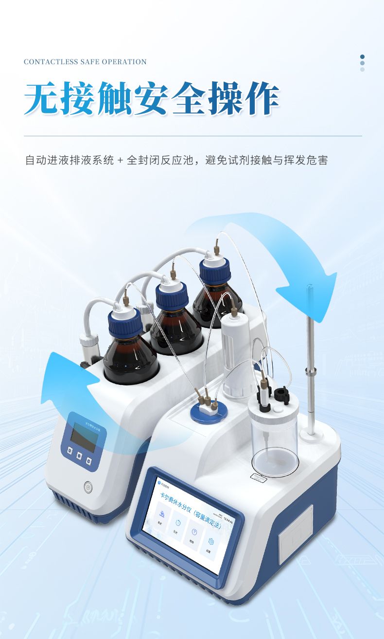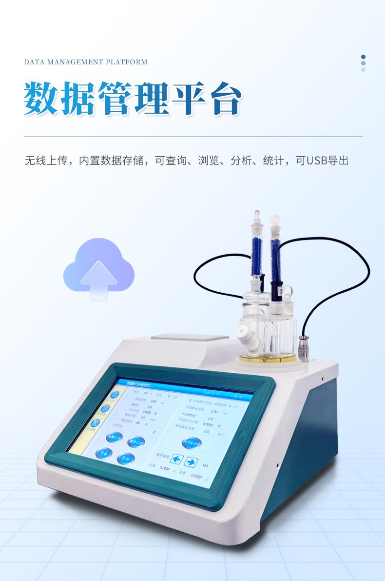 2.儀器具有試驗結(jié)果存儲、打印、計算功能;樣品測定過程由儀器自動控制,攪拌、測定60秒左右自動完成,直接顯示測定結(jié)果;全密封滴定池瓶,避免試劑與人接觸,也避免環(huán)境濕度的影響;儀器中文液晶顯示,并具有自動計算和打印功能,能打印出百分含量、樣品編號、試驗員、實驗日期等內(nèi)容;儀器準(zhǔn)確度為:①水含量小于10微克水時,測量值誤差小于2ug水;②水含量在10微克-1000微克水時,測量誤差≤2ug水;③水含量在1000微克以上時,測量值誤差≤0.2%(不含進(jìn)樣誤差);